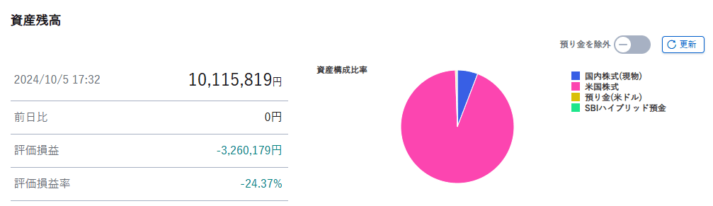 毎日資産報告 投資 X Facebook はてブ LINE コピー2024.10.05目指せ金融資産4億!どうもあちゃんです。本日の状況雇用統計の結果はぁ・・・。ってめっちゃ良すぎ!ドル円は下落!米株市場は上昇!ってことで自分の資産も1000万回復です。利下げペースがゆるやかになってソフトランディング成功!ってシナリオでいいのでしょうか?まさか利上げなんてことにならないことを祈ります。さあさあ、4億目指してあーげーてー!